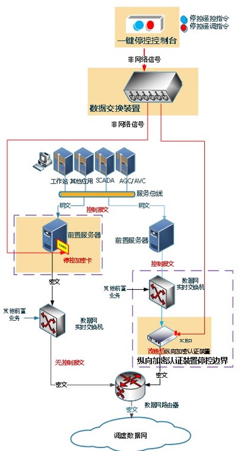 一鍵??叵到y(tǒng)由一鍵??乜刂婆_(物理觸發(fā)停控命令)、數(shù)據(jù)交換裝置、??卦O(shè)備(響應(yīng)??孛畹耐?乜v向裝置及??丶用芸ǎ┤糠謽?gòu)成,裝置之間采用非網(wǎng)絡(luò)方式自定義串口通訊協(xié)議的光纖介質(zhì)實現(xiàn)互聯(lián)互通,屬于一個非網(wǎng)絡(luò)方式連接的局域網(wǎng),有效的保證了應(yīng)急處置實施的安全性和實時性,系統(tǒng)同時能夠向網(wǎng)絡(luò)安全管理平臺實時發(fā)送告警信息,告警內(nèi)容包括??乜v向裝置和??丶用芸ǖ淖钄嘈畔⒌?,確保網(wǎng)絡(luò)安全管理平臺可以對??叵到y(tǒng)進行實時監(jiān)控。