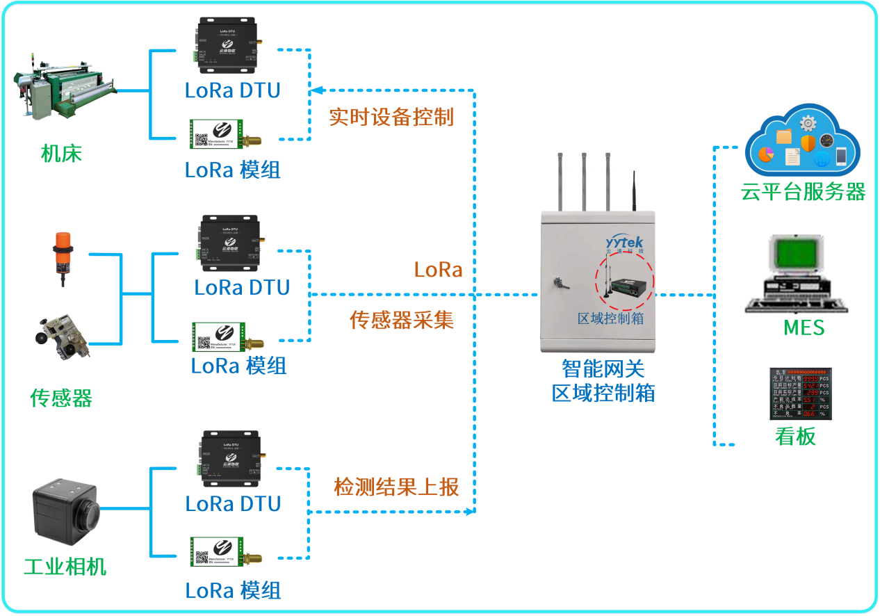 在工廠內(nèi)的各個(gè)終端節(jié)點(diǎn)(傳感器、工業(yè)設(shè)備、工業(yè)相機(jī))使用LORA DTU和LORA模組升級(jí)設(shè)備和傳感器,使設(shè)備具備無線傳輸能力,實(shí)現(xiàn)對(duì)生產(chǎn)數(shù)據(jù)的實(shí)時(shí)上報(bào)和操作指令接收。通過云涌智能無線網(wǎng)關(guān)對(duì)著這些終端節(jié)點(diǎn)進(jìn)行數(shù)據(jù)的采集和接收,再由網(wǎng)關(guān)進(jìn)行數(shù)據(jù)分析和協(xié)議轉(zhuǎn)換,與上層的不同業(yè)務(wù)系統(tǒng)進(jìn)行數(shù)據(jù)的交互。