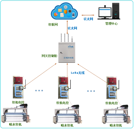 首先,工廠內(nèi)的各個(gè)終端節(jié)點(diǎn)(我們稱之為“織機(jī)電控“)集成LoRa 模組,使設(shè)備、傳感器具備無(wú)線傳輸能力,實(shí)現(xiàn)對(duì)生產(chǎn)數(shù)據(jù)的實(shí)時(shí)上報(bào)和操作指令的接收,一旦工業(yè)攝像頭通過(guò)AI算法識(shí)別到織機(jī)故障,便可通過(guò)LoRa模組及時(shí)上傳告警信息。然后,LoRa智能無(wú)線網(wǎng)關(guān)對(duì)這些終端節(jié)點(diǎn)的數(shù)據(jù)再進(jìn)行采集、分析和處理,并上傳到織聯(lián)網(wǎng)平臺(tái),最后,機(jī)器效率、產(chǎn)量和告警信息等一系列內(nèi)容就會(huì)通過(guò)大屏展示,及時(shí)提醒管理人員進(jìn)行設(shè)備故障處理。