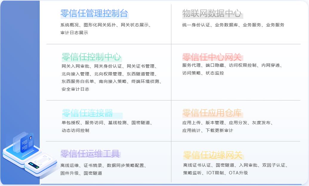 平臺(tái)由邊緣網(wǎng)關(guān)代理程序、網(wǎng)關(guān)離線運(yùn)維工具、控制中心、接入網(wǎng)關(guān)、應(yīng)用倉(cāng)庫(kù)等模塊組合而成。產(chǎn)品核心功能包括邊緣網(wǎng)關(guān)身份認(rèn)證、網(wǎng)關(guān)出入站訪問控制、網(wǎng)關(guān)間微隔離控制、邊緣應(yīng)用管理、網(wǎng)關(guān)安全運(yùn)維、網(wǎng)關(guān)數(shù)據(jù)存儲(chǔ)透明加解密等。同時(shí)平臺(tái)保護(hù)網(wǎng)關(guān)與北向數(shù)據(jù)中心的訪問安全,包括端口隱藏,通訊加密等。