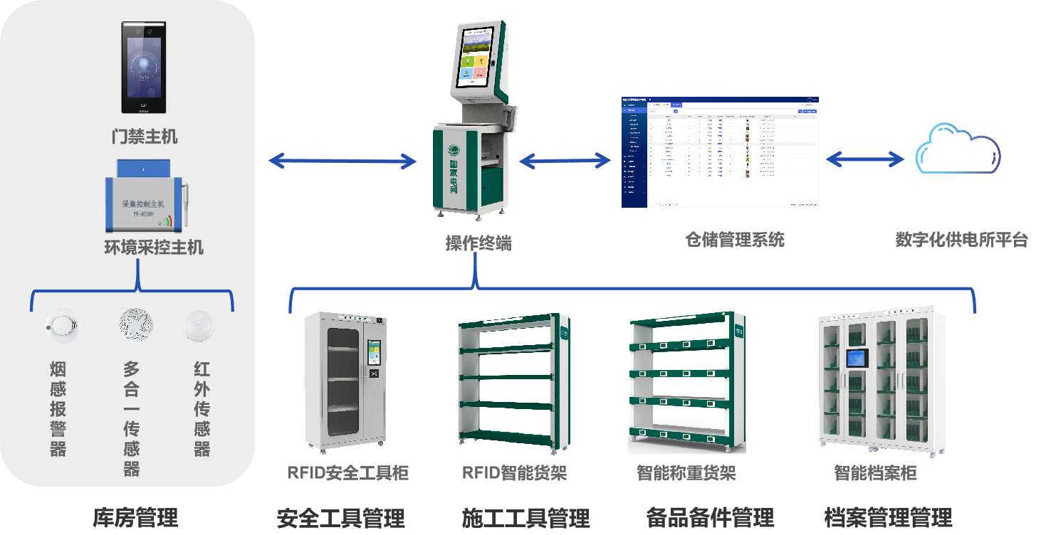 此外為了更好的實現(xiàn)自動控制、智能照明、安全防護以及數(shù)據(jù)分析,針對供電所“四庫“的室內(nèi)存儲環(huán)境管理,我們配有一整套專門的庫房管理系統(tǒng),以及系統(tǒng)配套的輔助設備,比如操作終端、RFID通道門和標簽等,并結合使用基于物聯(lián)網(wǎng)、云計算等新技術構建的智能一體化管控平臺,系統(tǒng)管理員不僅可以實現(xiàn)對多個庫房的站點管理,還能獲得更加智能化、多元化的管理解決方案。