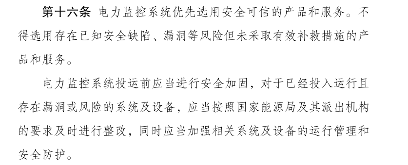 ? ? ? 第十六條明確提到:電力監(jiān)控系統(tǒng)優(yōu)先選用安全可信的產品和服務。