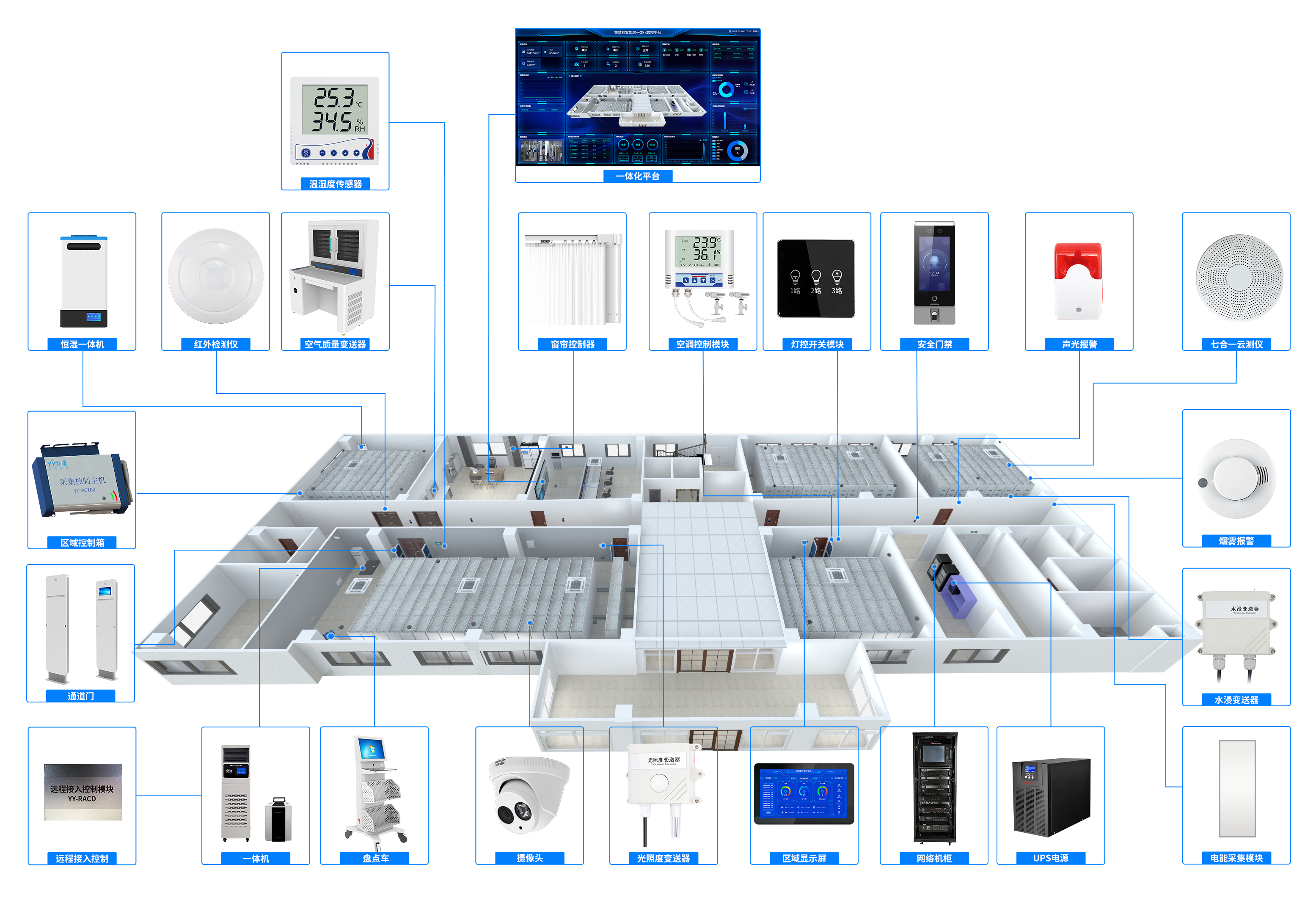 采集所有檔案室內的溫度、濕度、漏水、煙霧、空氣質量、人員侵入等數據,并能夠通過控制空調、凈化一體機等設備,達到自動調節(jié)溫濕度及空氣凈化的目的。